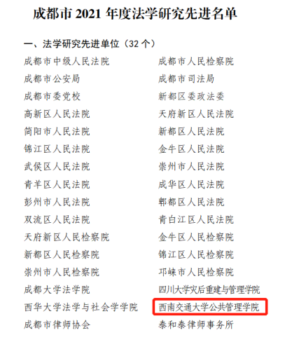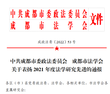 近日,从中共成都市委政法委员会、成都市法学会获悉,威廉希尔官网获成都市2021年度法学研究先进单位荣誉称号,威廉希尔官网教师邓君韬、法律硕士研究生金获获成都市2021年度法学研究先进个人荣誉称号。