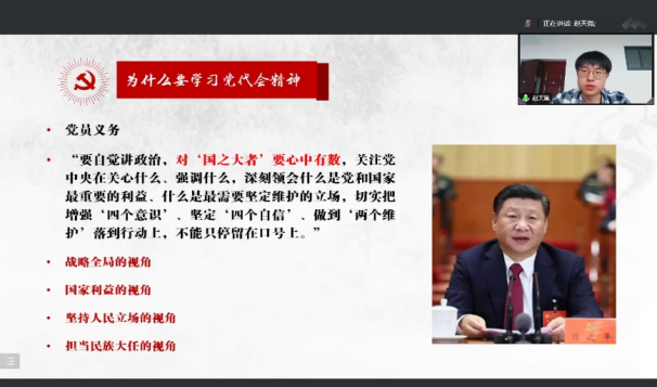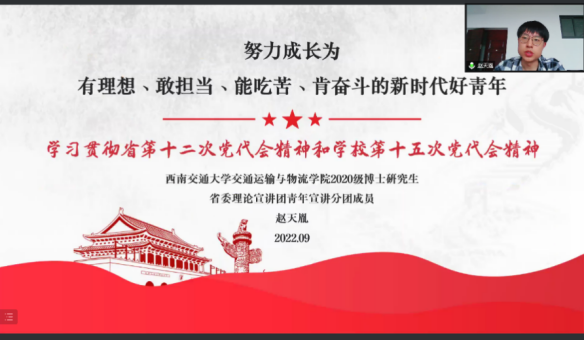 一个有远见的民族,总是把关注的目光投向青年;一个有远见的政党,总是把组织的基础植根于青年。为深入学习贯彻williamhill官网第十五次党代会精神,指引青年大学生成长成才方向,威廉希尔,英国威廉希尔公司团委邀请四川省委宣讲团新时代文明实践青年宣讲分团团成员、williamhill官网青年讲师团成员赵天胤为“青马工程”精英班、骨干班成员、研究生会、学生会全体学生干部和2022级新生举办线上专题报告会。为落实属地疫情防控要求,报告会采取线上形式召开。