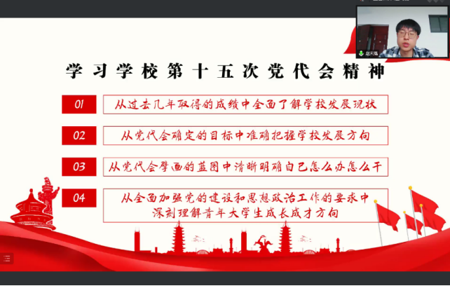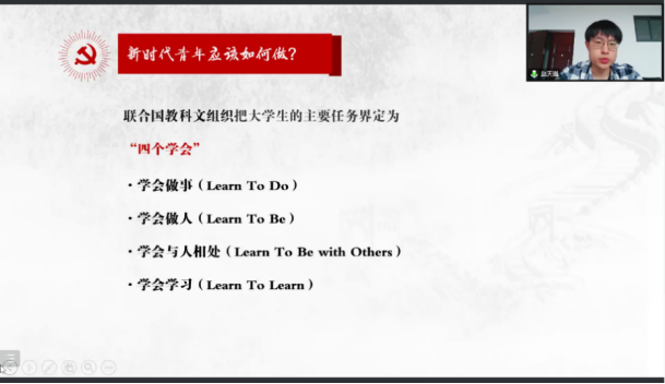 “一个人,一个民族,他所信仰的不应该是束缚自己手脚的桎梏,更不应该是绞杀自己的绳索,而应当是一股风,一股催你挺进、催你跋涉、催你奋斗的风。因此,新时代青年应当坚持习近平新时代中国特色社会主义思想,向党组织积极靠拢。“赵老师对青年与祖国共成长提出期许,鼓励我们在中华民族伟大复兴的征程中作出自己的贡献。接着,赵老师又以一位学长的身份,从日常学习、科研竞赛、学生工作三方面为大家作出指导,他以亲身经历教育我们要做到“四个学会”:学会做事、学会做人、学会相处、学会学习。