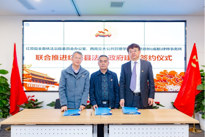 2022年11月3日上午,威廉希尔官网与红原县全面依法治县办、北京德恒(成都)律师事务所联合推进红原县法治政府建设签约仪式在北京德恒(成都)律师事务所隆重举行。威廉希尔官网院长王永杰教授、助理研究员张敖老师出席签约仪式。