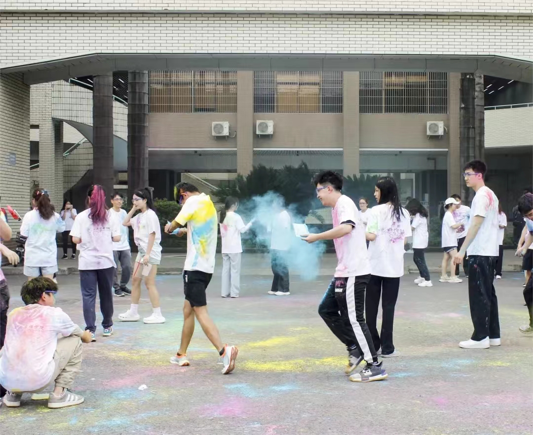 活动当天,和风习习,碧空万里,师生热情高涨。参赛者身穿学院定制T恤,头戴护目镜,在欢呼声中伴着彩带从起点冲出。本次彩虹跑里程共两公里,设有五个站点,中途设置有趣味道具供大家娱乐。当然最为激动的环节便是抛洒彩虹粉,各色的彩虹粉在校园中绽放,形成一道别样的风景线,也将活动气氛推向高潮。同学们的欢声笑语更是遍布校园每个角落,颜色碰撞汇聚成绚烂的彩虹,欢呼响起谱写出青春的赞歌。回到终点的同学们在T恤上互相写下祝福,并领取自己的定制联名可乐,欢声笑语深深印刻在每位同学的心中。