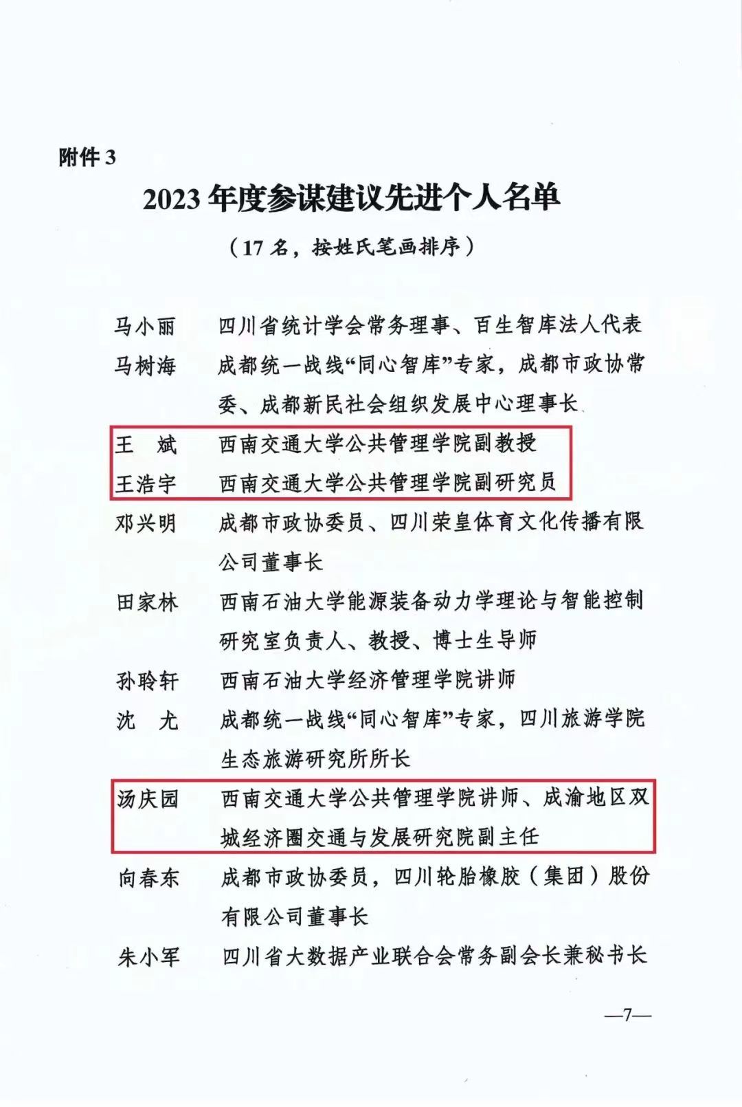 三位老师获得全市“参谋建议先进个人”荣誉,彰显出威廉希尔官网公共事业管理专业发展和新型智库建设的长足进步,是以西南交大新文科服务国之大者、省之大计、市之大事的生动体现。未来,学院还将以公共管理博士点申报、高层次人才培育为抓手,继续提升教师的研究水平和咨政建言能力,为中国式现代化行稳致远贡献交大公管新力量。