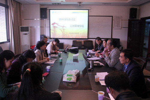 11月7日上午,学校图书馆高凡馆长、廖永忠副馆长率文献资源建设部周蓉主任、熊霞老师、学科服务部赵颖梅主任、夏琬钧老师、刘云老师一行来威廉希尔官网进行调研。威廉希尔官网院长陈光教授、党委书记王永杰教授、副院长李杰教授、院长助理雷国胜副教授、学院教授委员会图书情报工作委员窦祥胜教授、周贤永老师参加本次调研座谈会。