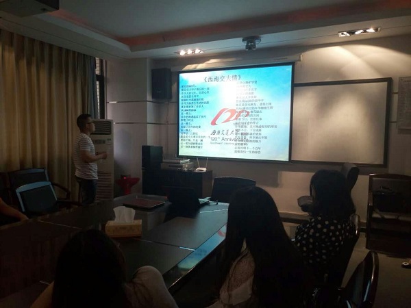 本次班会由班长米怡主持。班长首先为大家介绍了williamhill官网的建校史,着重介绍了三个校区的搬迁史及学校的更名史,进一步深入了全班同学对williamhill官网的了解。班会重点放在了“爱在交大“上,虽然同学们来自全国各地,然而在研究生生活即将满一年之际,借着学校校庆的氛围,同学们对交大的归属感、同学们与老师的融入感、同学之间的亲切感也日渐加深。班会上,王东同学深情诵读了自己为交大校庆作的诗《西南交大颂》,赢得了大家的热烈掌声。班长还为大家播放了学校建校史的小视频。