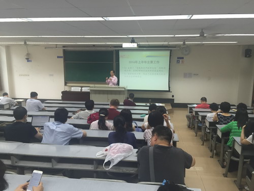 2016年7月7日,公共管理与政法学院在逸夫楼4209召开了全院教职工大会,会议由学院党委副书记余小英主持。
