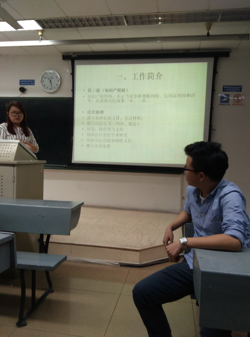担任法官助理的师兄师姐们给大家分享了他们在法院的实习经历。首先上台给大家分享的是温雯学姐,她现在在法院的民三庭担任法官助理。她微笑着给我们谈了她在法院的工作内容,如何拟写各种司法文书,如何学会独立承办案件。分享中,她谈到了她在法院的最大收获,就是弄清了办案的基本流程,并培养了自己的抗压精神,在与律师,当事人沟通交流中,她慢慢克服了刚开始的各种恐惧症。接着上台分享的是敦雪梅师姐,她给我们分享了立案二庭的工作内容,从再审审查到信访最后到维稳,告诉了我们在法院如何阅卷,询问当事人,法官们是如何合议,并最终如何做出法院判决和裁定。并特别给我们强调了懂法的重要性。在依法治国的当代中国,法律,是治国之重器!第三位上台分享的是15级的胡静师姐,她在法院同时兼任书记员和法官助理工作,师姐细致地向我们描述了法院的工作环境和现状。在她的分享中,胡静师姐告诉我们:作为法律人,我们不仅要学好法律的理论知识,更要学会如何去学以致用。因为在实践中,有太多太多的考量因素,需要我们去探讨和研究。分享会中,同学们畅所欲言,给老师和师兄师姐们进行了自由交流,对法律职业有了新的认识和感悟。
