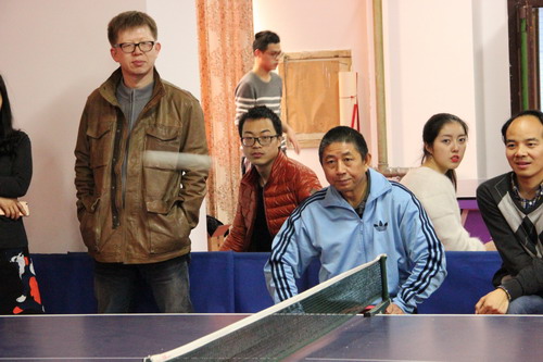 下午15:30分,备受瞩目的师生友谊赛开始了。刘斌老师第四小组与王再锋老师第一小组比赛的战况异常激烈。在第一轮同学较量失利的情况下,第二轮由李明老师对战申蓉老师。李明老师的接发球发挥稳定,连续进攻,申蓉老师反拉球出界,6:3李领先。之后几个回合,申减少失误,连续进攻,将比分追至平手。李接发球不断变化,抢攻得分,最后以11:8的分数拿下第二局。至关重要的第三局由刘斌老师对战王再锋老师。双方第一个球就展开对拉,王回球出界,刘1:0领先。随后刘正手拉直线连续得分,比分打至3:0。双方打的难解难分,比分打至8:7,刘仅领先一分。王正反手进攻遏制刘的反手位,扳回一局,双方战至8:8平。老师球斗得激烈,台下同学也屏住呼吸紧张观战。刘利用抢攻搏杀与王周旋,王主动进攻失误,正手拉球下网。随后,刘扣球得分,10:8来到赛点。在关键时刻,刘发了近网侧下旋球,拿下最后一分,以11:8的比分获得第三局胜利,并获得此轮小组赛胜利。接着,刘斌、李明老师小组继续保持稳定的比赛水准,以绝对优势获得师生友谊赛小组成绩第一名。王再锋、申蓉老师小组获的第二名,周贤永、陈冬菊老师小组和史云明、唐立敏老师小组获的此次师生友谊赛的第三、四名。