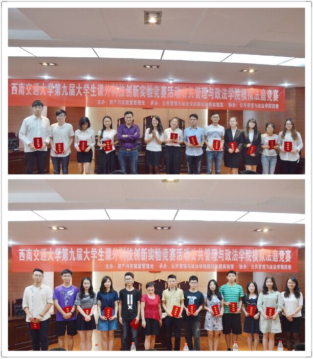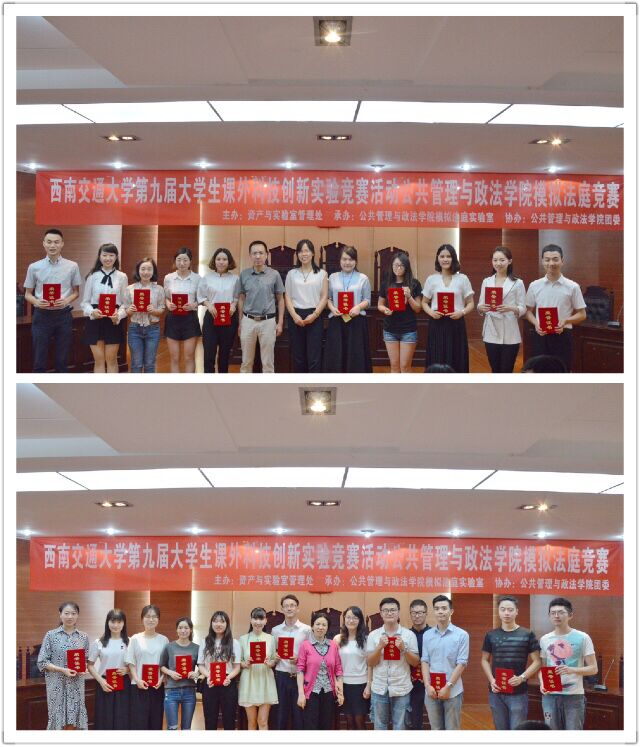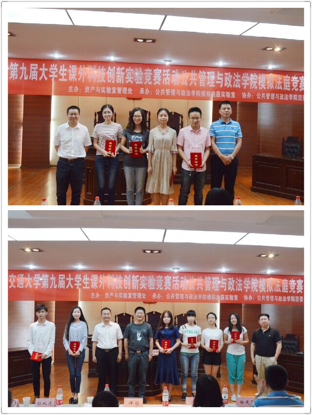 赛程的最后一项是颁奖典礼,由各位专家评委为获奖团队颁奖,并合影留念。至此,模拟法庭竞赛活动圆满结束。模拟法竞赛为同学们提供了一个展示自我、锻炼自我、提升自我的舞台,更为同学们打造了一个交流思想、明辨是非、学以致用的广阔平台。公共管理与政法学院法学系、模拟法庭实验室也必将贯彻执行williamhill官网大学生课外创新实验竞赛活动的宗旨,不断积累和总结模拟法庭活动的成功经验,将模拟法庭竞赛这一品牌赛事办的更好。