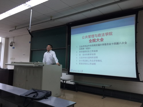 2017年9月1日上午10:30,公共管理与政法学院在九里校区逸夫馆4316教室召开全院教职工大会,会议由院党委书记王永杰主持。