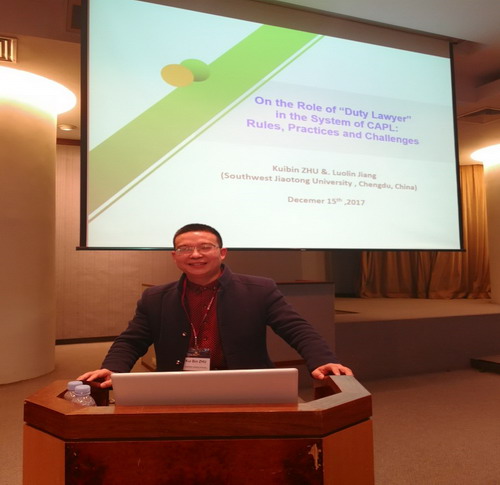 朱老师参加演讲的是“公益律师理论与实务”分论坛,其分为两个单元,都由现任亚洲法与社会学学会会长宫泽节夫教授主持,新加坡国立大学海伦娜·惠伦·布雷基教授担任评论人。第一单元,首先日本奈良女子大学大冢宏教授对日本的公益律师事业发展从规则实际影响的角度进行了解读。韩国西江大学教授Park Yong Chul对于韩国政府和法院在公益律师活动中所起的主导作用,韩国东川基金会的Takgon Lee对法定公益法律服务的要求,韩国成均馆大学Patricia Goedde教授就韩国的公益律师在保护弱势群体的权利方面的作用做了演讲。第二单元首先由加拿大多伦多大学的许菁芳教授对于台湾地区的法律援助基金会的实证研究作了介绍。然后由香港大学的傅华林教授从比较法的角度对于中国公益律师的变迁做了演讲。朱老师基于提交给会议的论文就“认罪认罚程序中的值班律师的职能及其实际功能与存在的问题”(On the Role of “Duty Lawyer”in the System of CAPL: Rules, Practices and Challenges)做了介绍、评述和反思。他首先通过对比美国的辩诉交易制度,简介了中国的认罪认罚从宽制度的特点及其对律师辩护提出的新要求,然后强调了值班律师制度演化的简要过程及其在认罪认罚制度下的功能预设,进而结合国内其他学者的研究,分析了当前值班律师制度运作的实际情况,所取得的成绩和存在的问题。最后,他指出了解决问题的对策,展望了在认罪认罚程序中提升值班律师实际功能的前景。最后,他提出了两个问题供与会者进一步思考、讨论。评论人对大家的演讲予以充分肯定,并对每位演讲者提出了一个问题。随后,分论坛成员就听众所提出的问题进行了解答。
