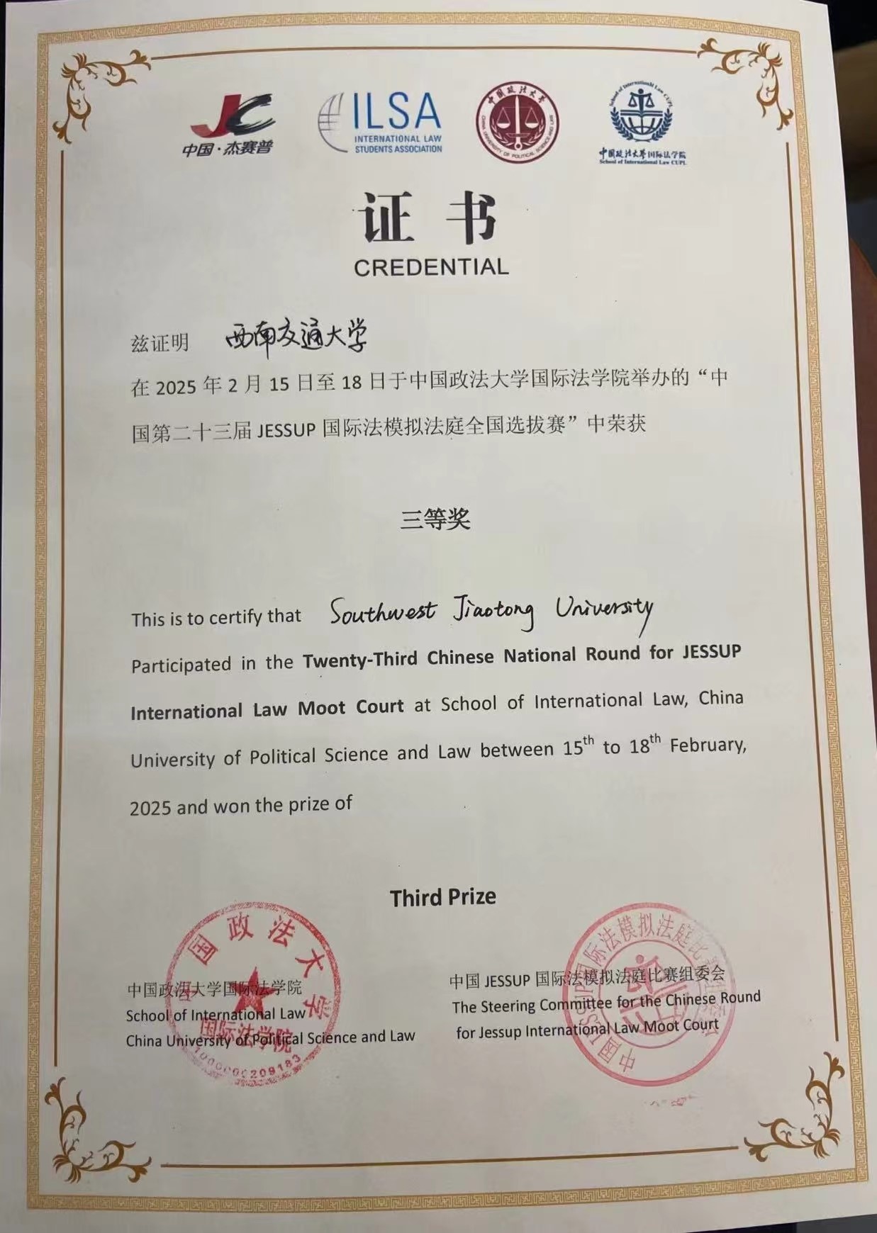 学院深入贯彻习近平总书记在党的二十届三中全会上的重要指示精神,积极响应国家关于加强涉外法治人才队伍建设的号召。本次赛事取得的优异成绩代表着学院国际法教学、涉外法治人才培养理论与实践相辅相成的卓越成果,也为西南交大涉外模拟法庭的队伍建设与经验积累添砖加瓦。此次宝贵的参赛经历使选手们在国际法知识储备、法学前沿理论、专业法律检索、法律英语表达与英文辩论技能等方面获得深度锻炼与提升。