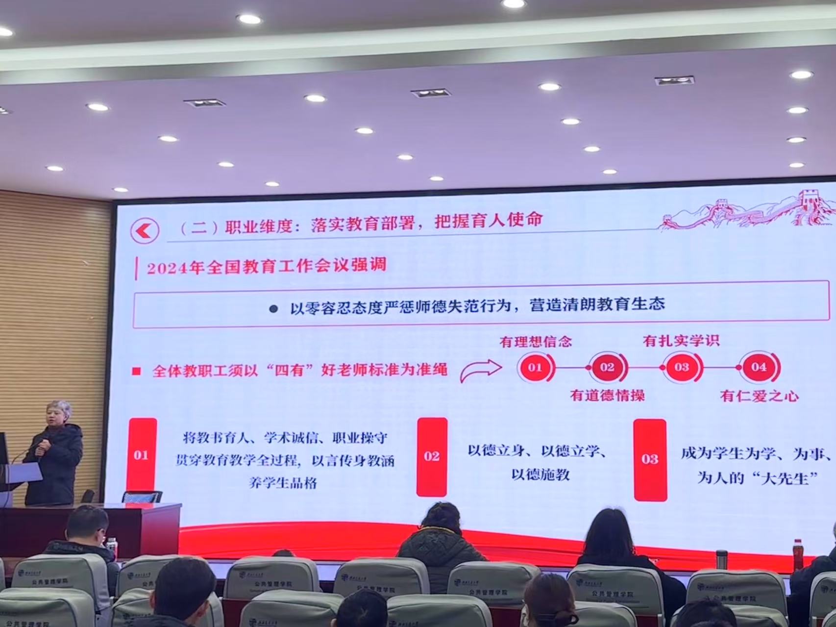 会上,高凡从“三个维度”细致深入地讲解高校教师如何准确把握师德师风,提高政治站位。高凡指出,教育事关国家发展与民族未来,高校教师应当坚持学习贯彻中央精神、落实教育部署、严守纪律底线,在做好自身本职工作的同时,增强政治自觉、把握育人使命、坚守职业初心。