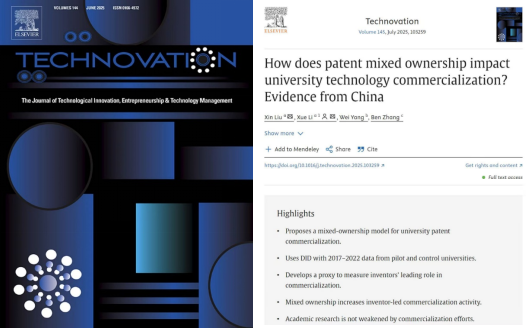 近日,学院刘鑫研究员与其指导的博士研究生李雪,及其合作者华中科技大学管理学院阳维老师、法学院张奔老师,在科技政策与创新管理领域国际顶刊Technovation上发表题为“How does patent mixed ownership impact university technology commercialization? Evidence from China”的研究论文,实现了学院在国际权威期刊上的新突破。