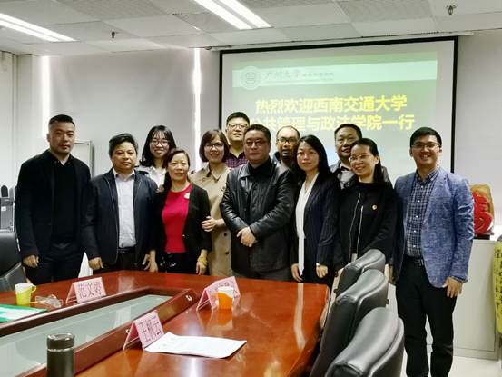 2019年3月11日,威廉希尔官网院长助理彭川宇副教授与公共管理系系主任刘桂花副教授、公共管理系老师颜学勇博士,政治系老师林晶晶博士、范文婷博士一行到广州大学威廉希尔,英国威廉希尔公司就本科生实验班建设情况进行调研。广州大学威廉希尔,英国威廉希尔公司院长陈潭教授、党委书记刘雪明教授、副院长王枫云教授、政府管理系党支部书记杨芳副教授、系主任蒋红军副教授、刘建义副教授参加了交流座谈。