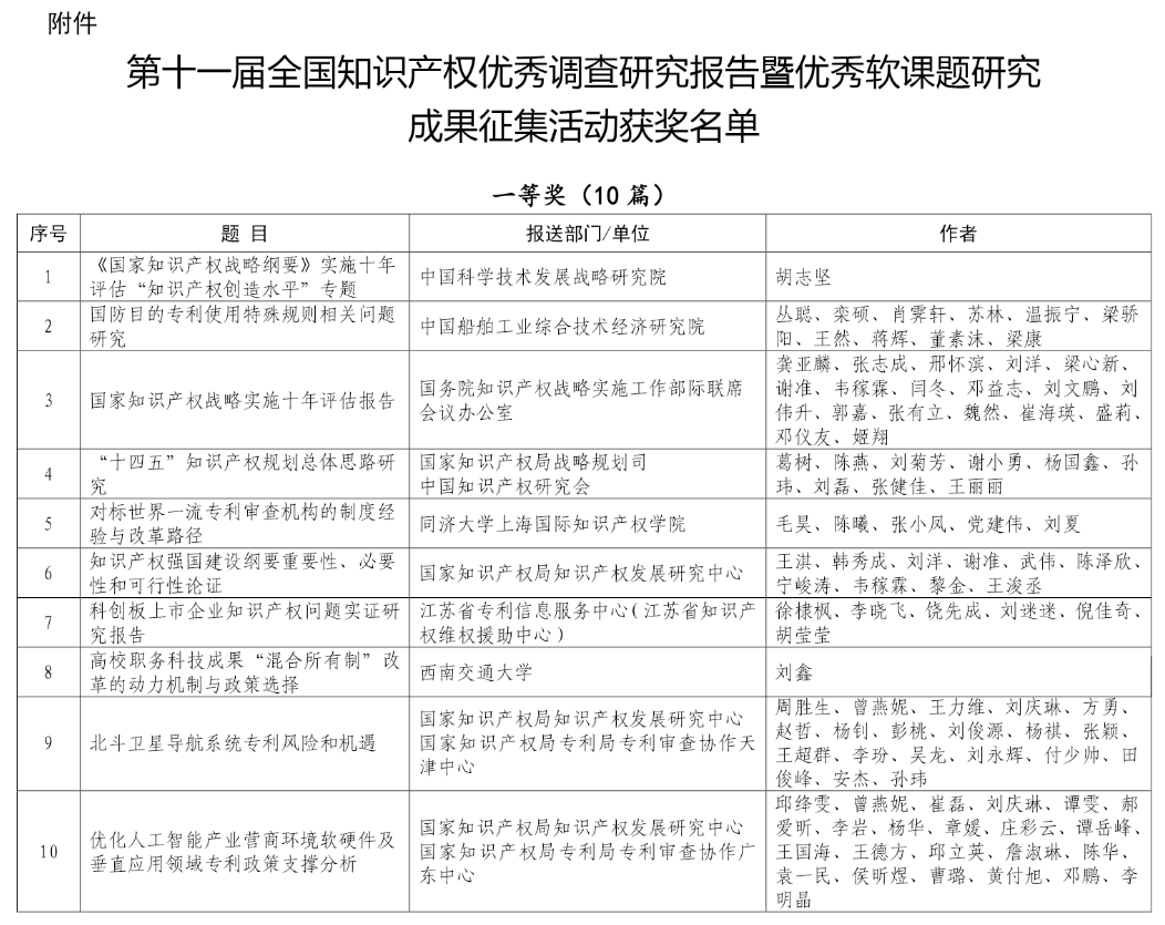 据悉,第十一届全国知识产权优秀调查研究报告暨优秀软课题研究成果征集活动由国家知识产权局主办,共收到全国报送作品210篇,参评作品来自国务院相关部委、地方知识产权局、高校、科研院所等单位,作品内容涉及知识产权政策制度完善、知识产权强国建设、知识产权“十四五”规划研究、国际热点问题研究等方面。按照评选标准和程序,经专家初评和评选委员会评选,共评出获奖作品45篇,其中一等奖10篇、二等奖15篇、三等奖20篇。
