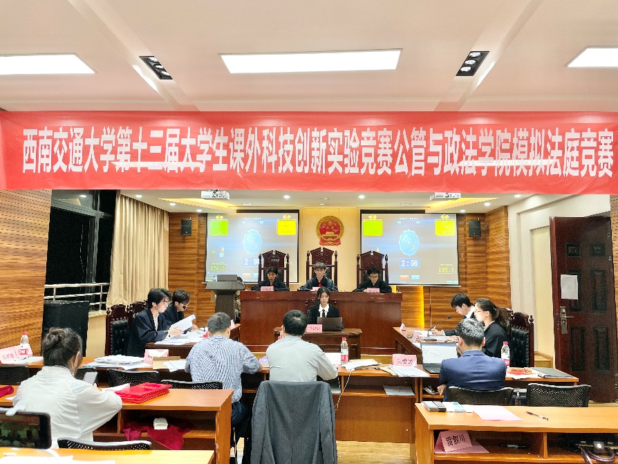 本次竞赛决赛特别邀请到了成都市中级人民法院未成年人及家事案件综合审判庭副庭长胡炀威法官、四川省英济律师事务所主任吴爱民律师作为校外专家评委,与我校富有法律实践经验的邓大鸣教授共同担任竞赛的评审工作。公共管理与政法学院副院长雷叙川副教授于百忙之中莅临竞赛现场并致辞,竞赛案例的设计者公共管理与政法学院法学系杨成良副教授也来到现场观摩参赛团队的模拟庭审,并对案例中所涉法律要点进行专业剖析。模拟法庭实验室张荣荣老师全程参与了竞赛的协调、组织和实施工作。随着参赛选手与工作人员的就位,决赛正式拉开序幕。