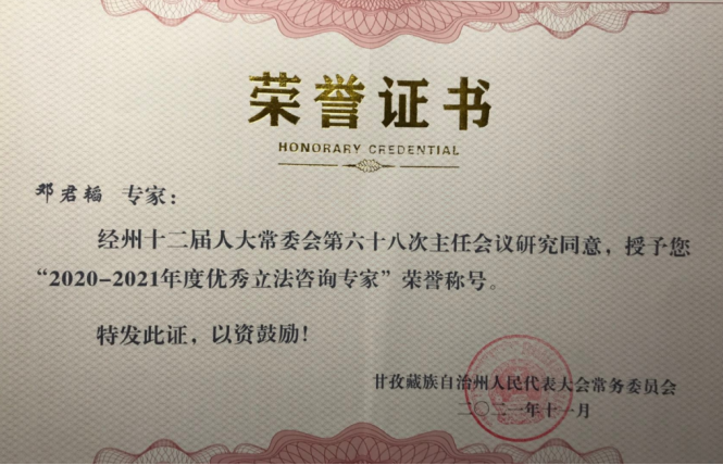 近日,从甘孜藏族自治州人大常委会办公室获悉,经州十二届人大常委会第六十八次主任会议同意,威廉希尔官网教师邓君韬副教授被确立为甘孜藏族自治州人大常委会“2020-2021年度优秀立法咨询专家”表彰人选(甘人常办[2021]91号),这是继2020年后威廉希尔官网教师第二次获地方人大表彰。