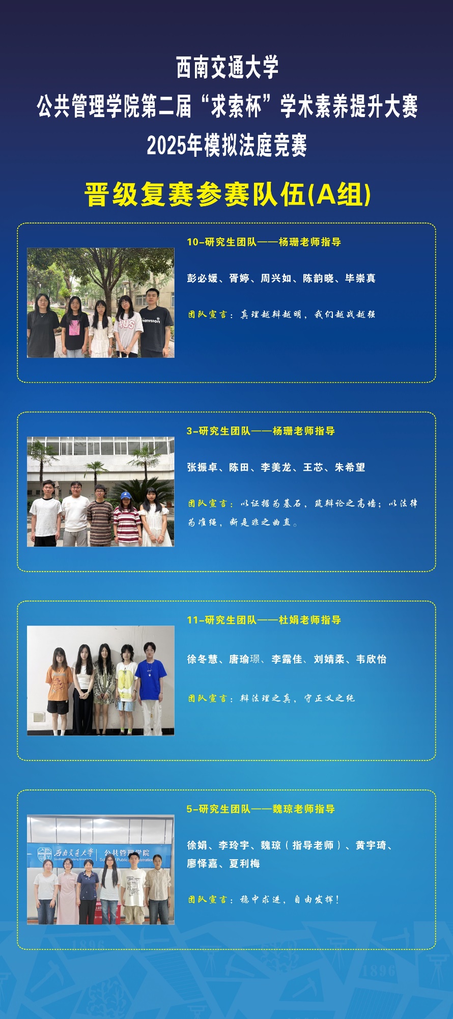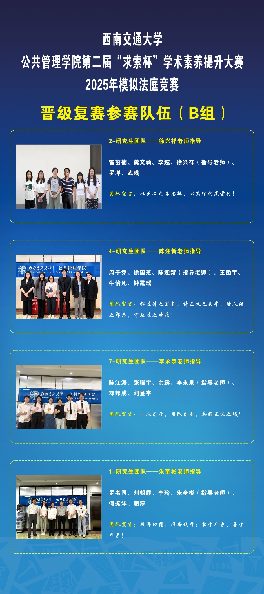 由williamhill官网研究生院主办,威廉希尔,英国威廉希尔公司、成都市青白江区人民法院、威廉希尔,英国威廉希尔公司模拟法庭实验室、威廉希尔,英国威廉希尔公司团委、威廉希尔,英国威廉希尔公司学生会、研究生会、大学生法律协会承办的威廉希尔,英国威廉希尔公司第二届“求索杯”学术素养提升大赛2025年模拟法庭竞赛于4月初拉开帷幕。本次竞赛案例由成都市青白江区人民法院提供,我校研究生组成共11支参赛队参加了本次模拟法庭竞赛。在初赛中各参赛团队根据竞赛案例案卷材料,提交了包括民事起诉状、民事答辩状、代理词、判决书等司法文书,由青白江区人民法院三位法官进行匿名评审,8支参赛队成功晋级,现通过抽签方式,分为A、B两组展开复赛。现对模拟法庭竞赛复赛赛事安排如下: