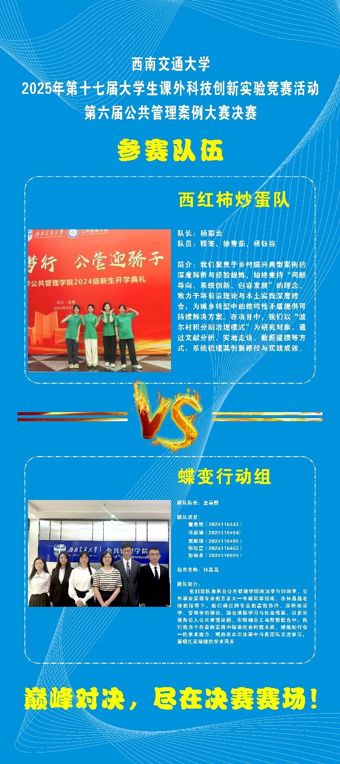 在复赛评选中,在导师回避、专业匹配的原则下,经过6名专家评审,两个分赛场组分别有一支参赛团队晋级第六届公共管理案例大赛决赛,现对决赛赛事安排如下: