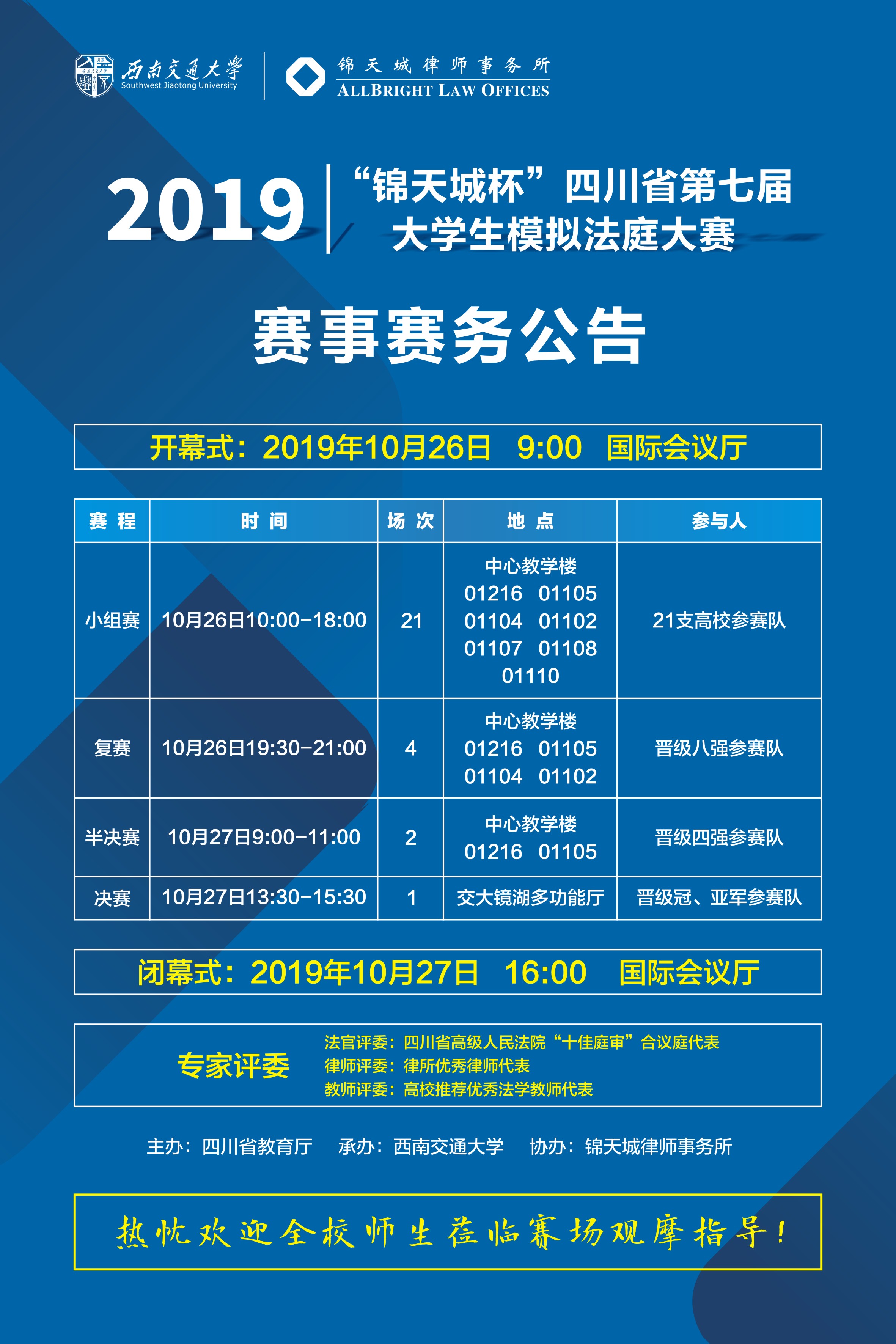 由四川省教育厅主办的“四川省第七届大学生模拟法庭大赛”将于2019年10月26日(星期六)、27日(星期天)在我校九里校区举行。