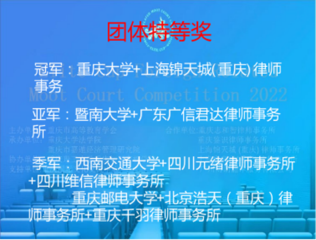 2022年12月18日,2022年第二届“领军杯”涉外模拟法庭全英辩论赛在重庆大学落下帷幕,经过激烈角逐,威廉希尔官网参赛团队勇夺本次高水平比赛的季军,荣获团体特等奖。