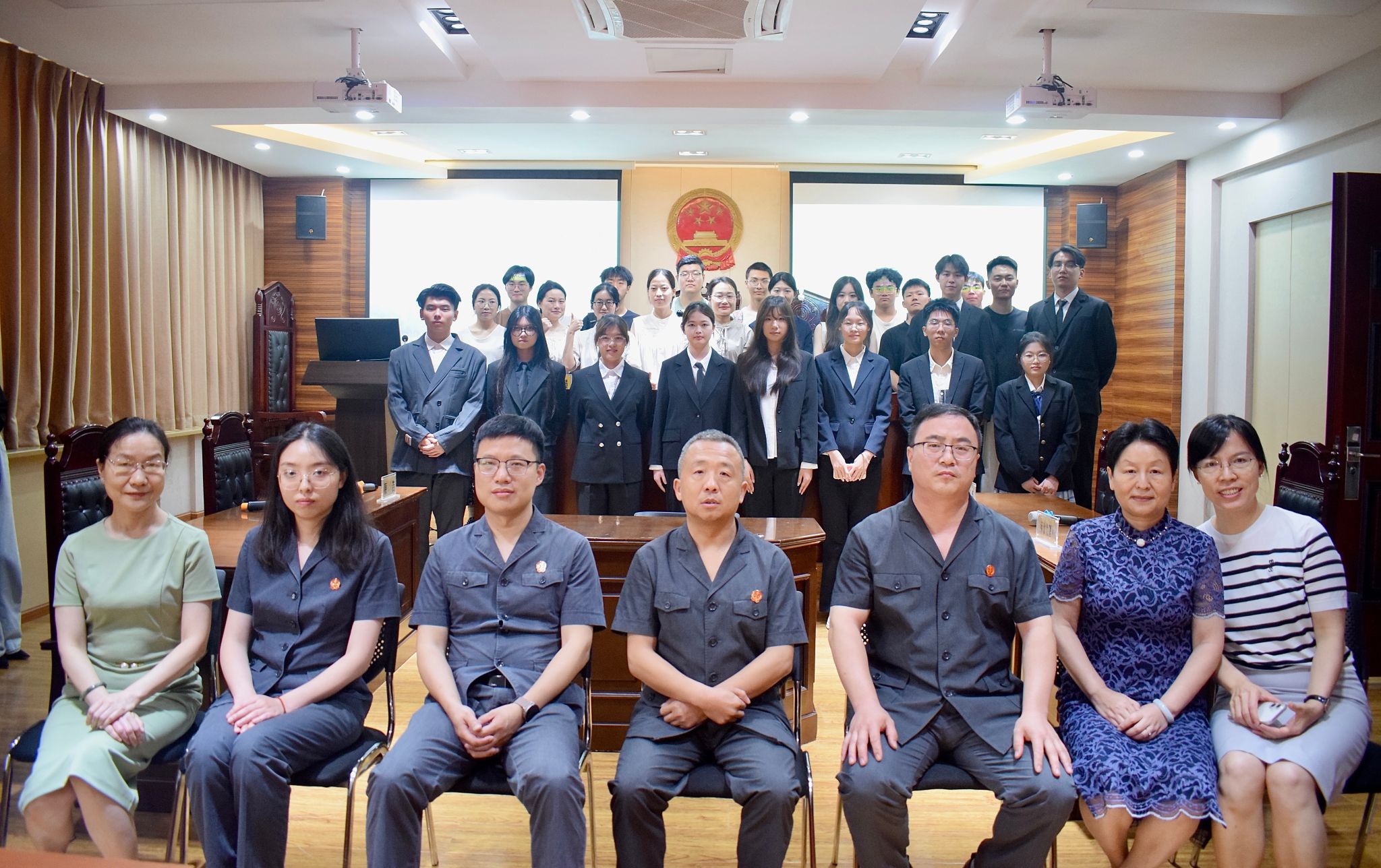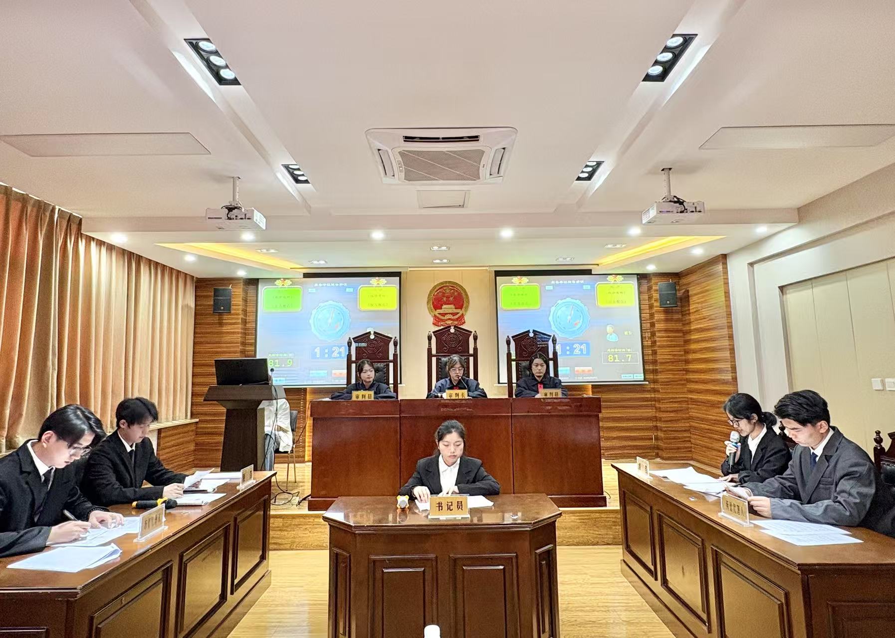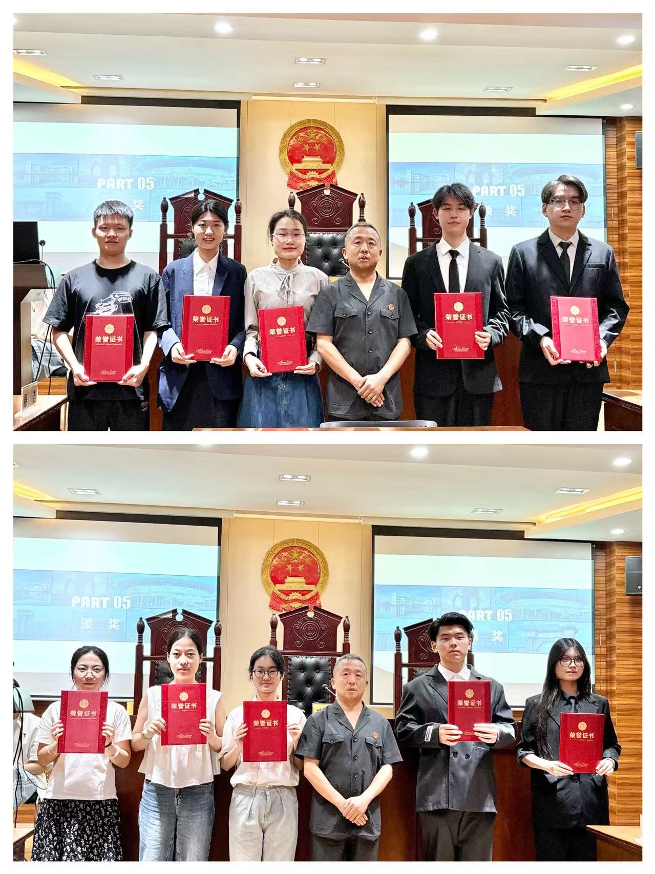 随着评审环节的结束,赛事迎来扣人心弦的收官时刻。在全场师生的屏息期待与热烈掌声中,王专委郑重揭晓了决赛成绩与竞赛最终获奖名单:余露团队凭借决赛中的出色表现摘得桂冠,廖怿嘉团队荣获亚军,两支队伍共同斩获一等奖;徐国芝、李美龙团队获得二等奖;何振洋、唐瑜璟、胥婷、李越四支团队荣获三等奖;苏醒、王媛团队获得优胜奖。随后,王专委、江庭长、马庭长和邓法官依次为获奖队伍颁发荣誉证书,并与全体参赛选手合影留念。