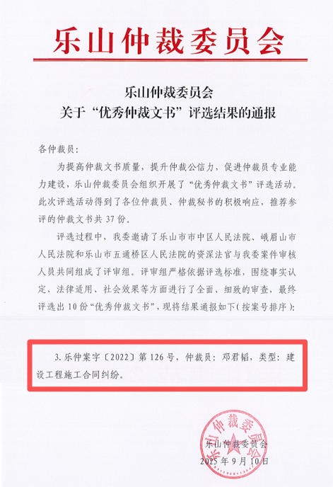 近日,从乐山市司法局获悉,威廉希尔官网法学教师邓君韬副教授担任独任仲裁员的一件涉教育系统建设工程施工合同纠纷裁决书获评乐山仲裁委员会“优秀仲裁文书”。