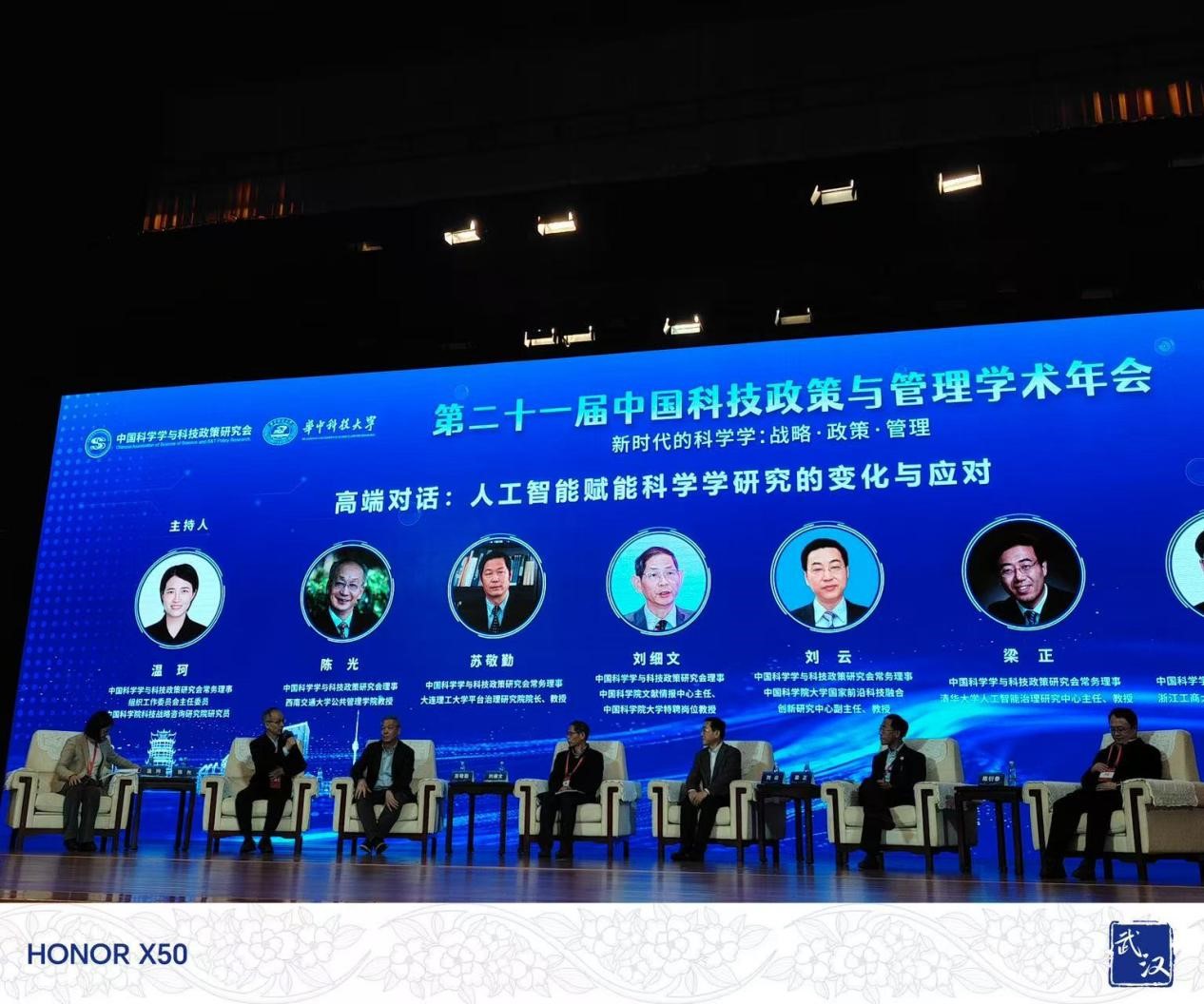 威廉希尔官网陈光教授以中国科学学与科技政策研究会理事、公共管理专业委员会主任身份参加年会,并主持公共管理分论坛学术会议、报告论文《中美科技竞争前景预测:发展与安全》,参加大会“高端对话”《人工智能赋能科学研究的影响与应对》,做《人工智能是把双刃剑》的报告。