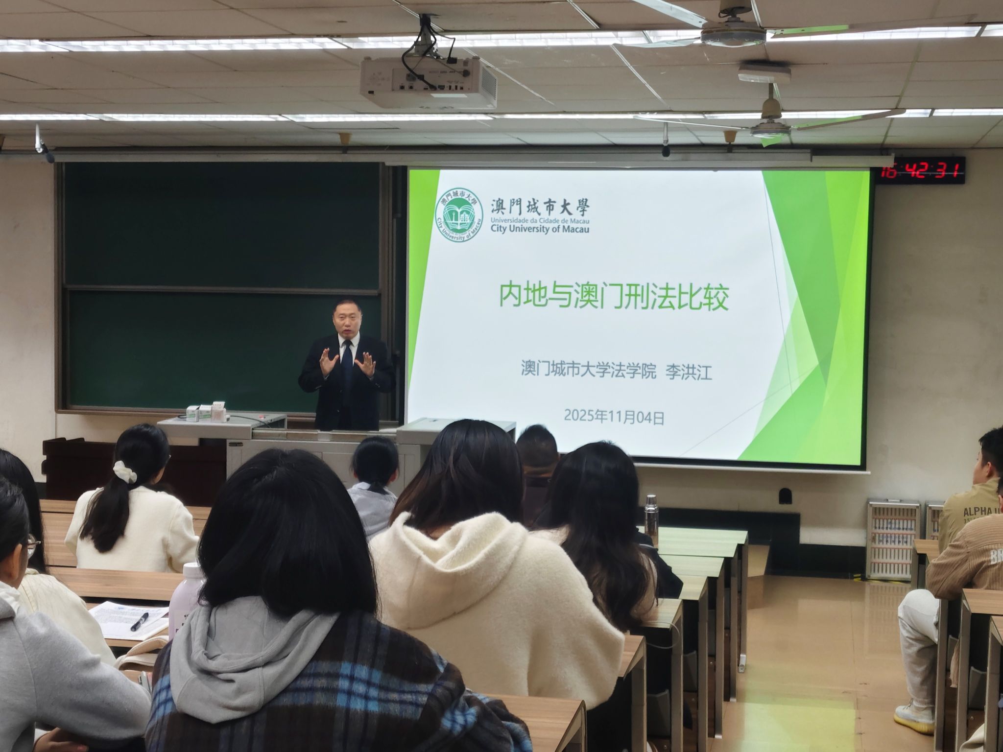 2025年11月4日,澳门城市大学法学院李洪江副教授应邀来到威廉希尔官网,作题为“内地与澳门刑法比较”的专题讲座。李洪江副教授现任澳门城市大学校学术委员会委员、澳门城市大学校董会成员、澳门法律改革咨询委员会成员、澳门《法政杂志》主编、澳门金融法律协会副会长、广东省法学会粤港澳大湾区建设港澳法治人才库港澳专家,曾任最高人民法院法官等职。