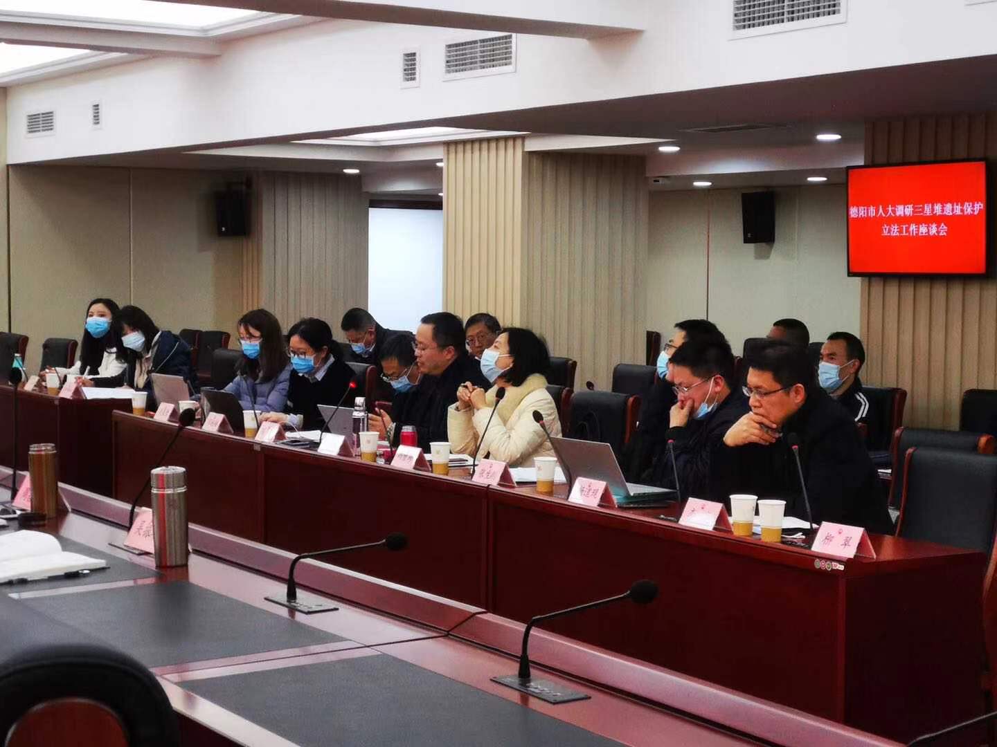 下午,威廉希尔官网师生与德阳市人大法制委、常委会法工委、教科文卫委、市委编办、市文旅局、市司法局以及广汉市人大常委会、文体局、自然资源局、农业农村局、发改局、住建局、公安局、执法局、三星堆博物馆等10余家单位有关负责人、德阳市级立法咨询专家近30人召开立法调研座谈会。邓君韬就三星堆遗址管理运行机制、遗址保护区文物保护补偿等问题进行了解,杨道现对保护区农户安置、土地流转、相关上位法衔接等问题进行询问,通过座谈沟通三星堆博物馆遗址保护管理体制、行政职权划分、保护现状、突出问题、建议举措等议题,以期厘清职责边界、确定保护重点、平衡各方利益,夯实三星堆遗址保护法规文本起草基础,实现保护与发展并重,居民生活水平提高、城市建设与文化遗址及环境保护协调发展。立法调研座谈会议由黄晨鹭记录并整理。