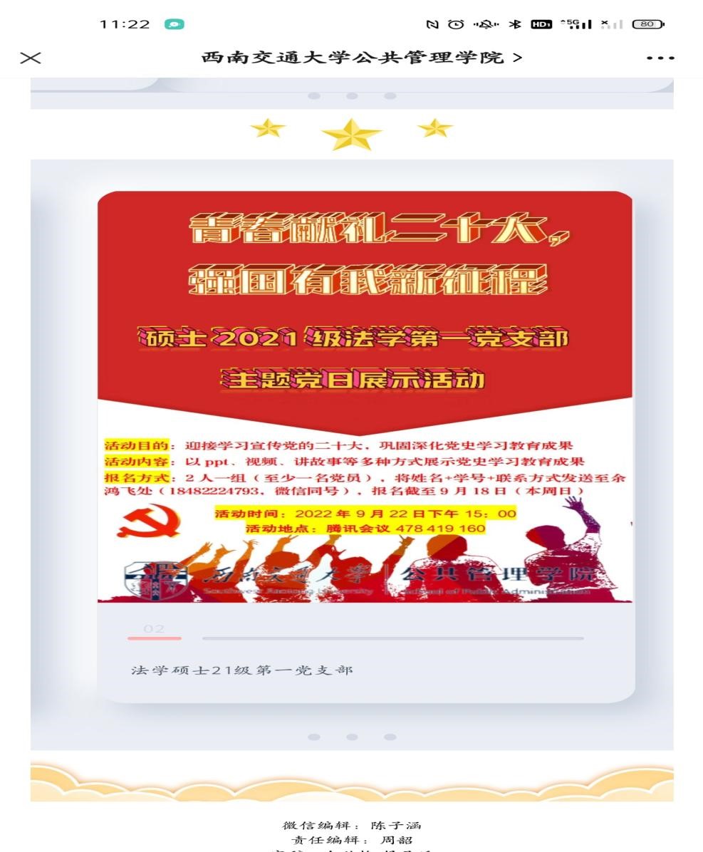 为迎接学习宣传党的二十大,在同学中广泛宣传党的十八大以来党和国家事业取得的历史性成就、发生的历史性变革,宣传习近平总书记对同学们的关心关怀,学习党领导中国青年运动的光辉历程,引导各党员同志深刻感悟“两个确立”的决定性意义,增强“四个意识”、坚定“四个自信”、做到“两个维护”的重要意义;同时为实现第二个百年奋斗目标、实现中华民族伟大复兴的中国梦凝聚起强大青春力量,激励全体党员同志攻坚克难、开拓奋进,9月22日下午硕士2021级法学第一党支部面向威廉希尔,英国威廉希尔公司全体研究生组织开展了“青春献礼二十大,强国有我新征程”主题党日展示活动。因疫情防控要求,本次活动会议在腾讯会议上展开。