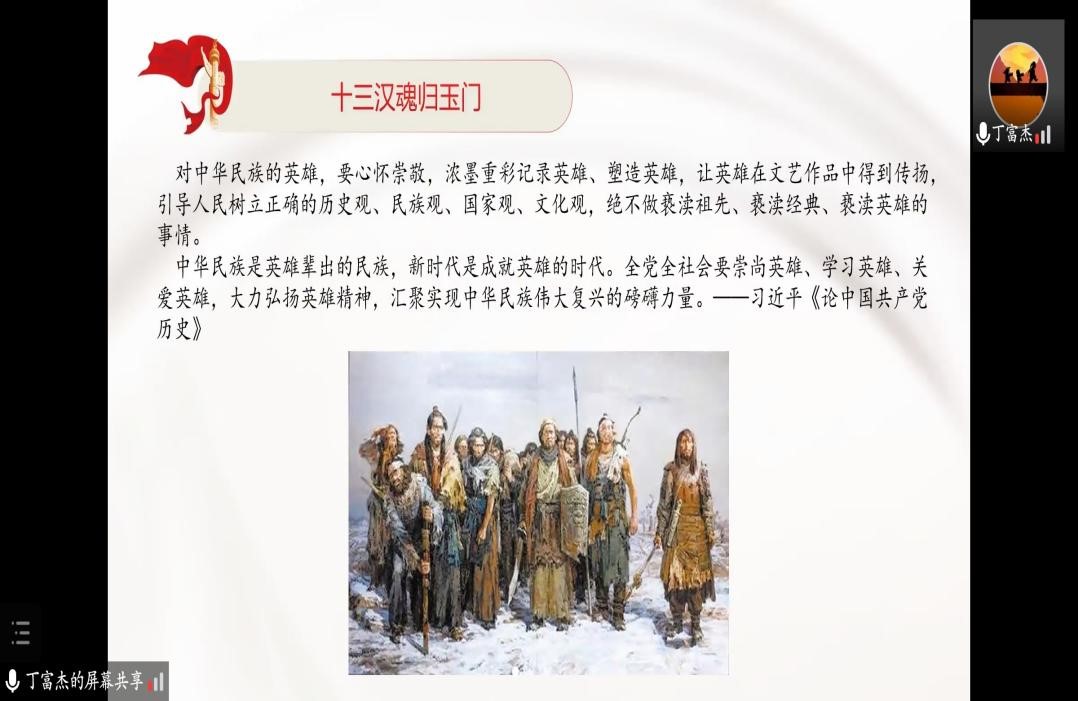 第二组的分享由邓悟同学和丁富杰同学开展。两位同学以“弘扬伟大抗美援朝精神”为主题,讲述了抗美援朝战争的重大意义,还提到了十三汉魂归玉门。抗美援朝伟大胜利,是中国人民站起来后屹立于世界东方的宣言书,是中华民族走向伟大复兴的重要里程碑,对中国和世界都有着重大而深远的意义。他们强调,无论时代如何发展,我们都要汇聚万众一心、勠力同心的民族力量。在抗美援朝战争中,中国人民在爱国主义旗帜感召下,同仇敌忾、同心协力,让世界见证了蕴含在中国人民之中的磅礴力量!