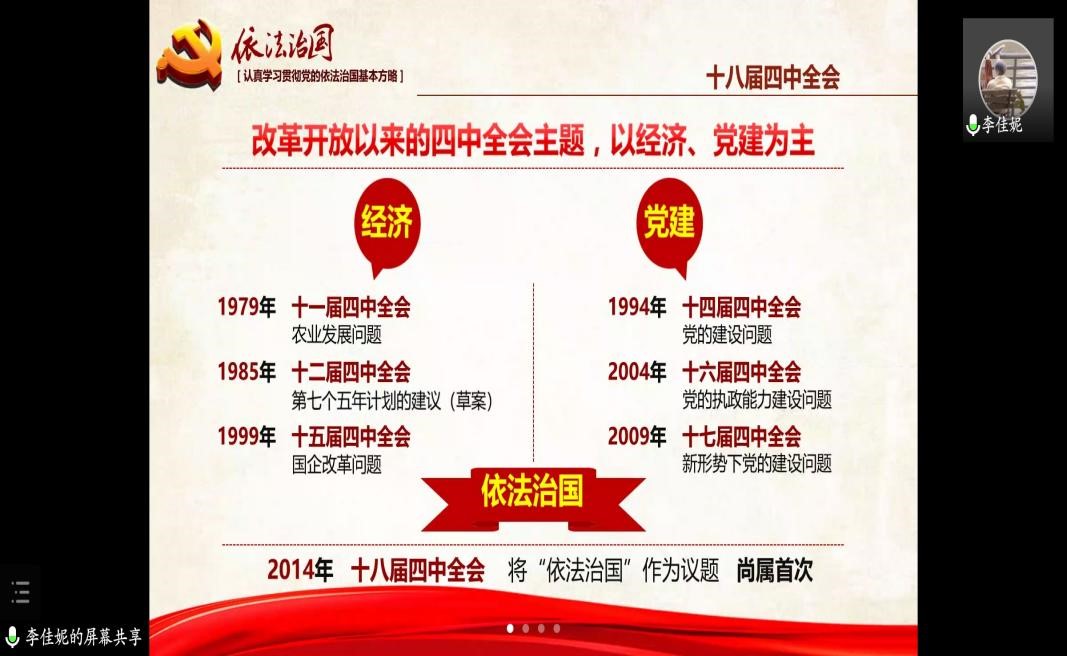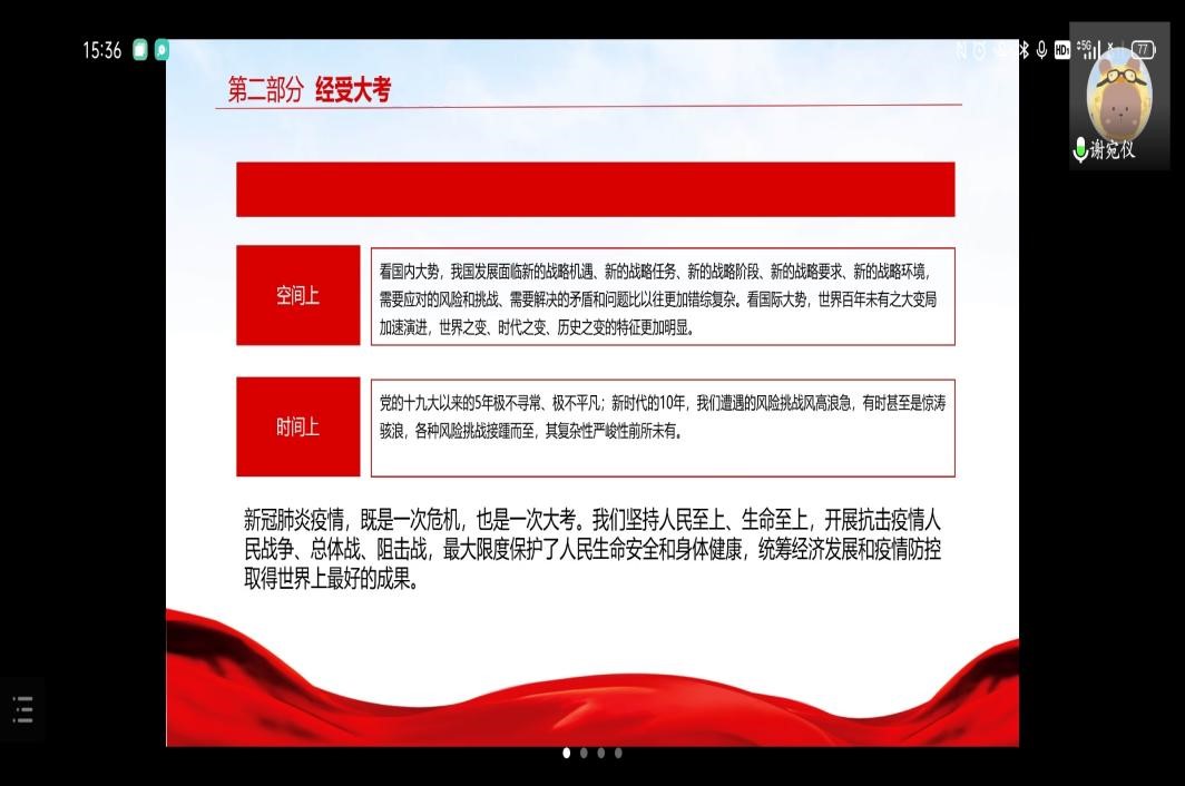 第一组分享的成员是:李佳妮和罗学彬。他们主要介绍了《中共中央关于党的百年奋斗重大成就和历史经验的决议》的内容、基本框架等,使得参会人员深刻体会了决议的意义和重要性,激发了参会人员认真学习党的百年奋斗重大成就和历史经验的决心。
