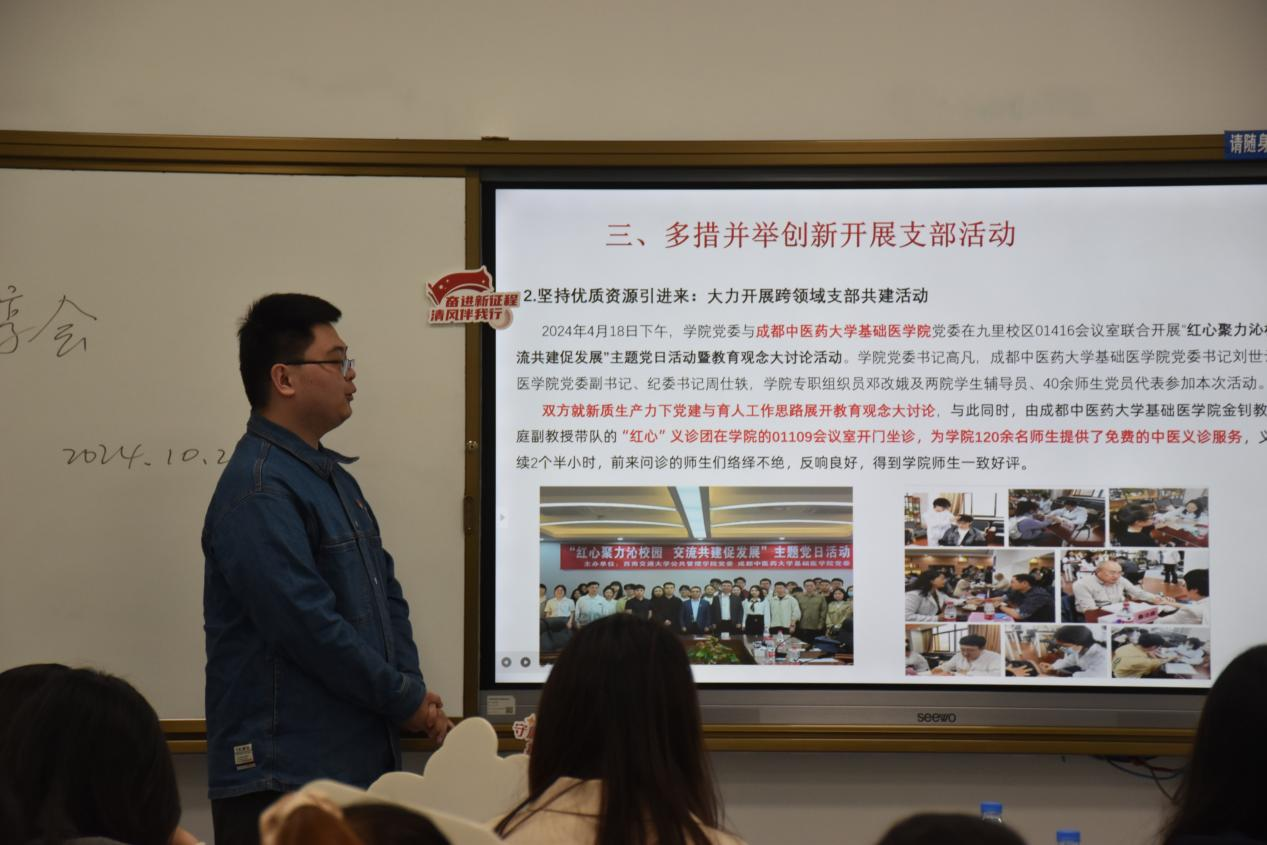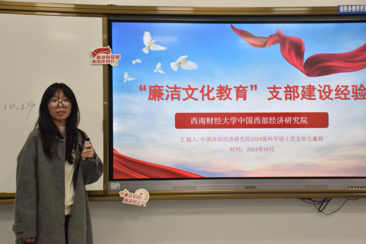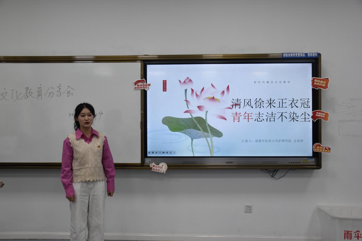 在“花语廉心”廉洁文化教育基地的参观结束后,活动转至西南财经大学经世楼B108室内进行。三所学校的学生代表围绕廉洁文化主题进行了各具特色的PPT展示,从不同的角度分享了各自学校在廉洁教育方面的实践与成果。威廉希尔,英国威廉希尔公司的学生党员代表庞鸿源,以“廉洁铸魂强根本,挺膺奋进建新功”为主题,从何为廉、为何廉、何以廉三个角度穿起威廉希尔,英国威廉希尔公司对于新时代廉洁党政工作的理解和作为,学院秉持以“廉”促教、以“廉”育人的工作理念,把加强校园廉洁文化建设作为一体推进“三不腐”的基础性工程和落实立德树人根本任务的重要举措,持续深耕校园廉洁文化建设,打造廉洁文化教育阵地,推动清正廉洁政治底色根植人心;成都中医药大学的学生党员代表文莎莎,则是以案例带领大家深入思考,警示同学们不能犯红线错误,要留清白在人间。并在展示的过程中,抛出问题“青年何以清廉”将廉政建设的种子播撒在每个人的心中;最后是西南财经大学的学生党员代表毛鑫硕,鲜明直接的切入主题,分享了在新时代廉洁文化建设中,西南财经大学党支部的角色定位和具体作为。