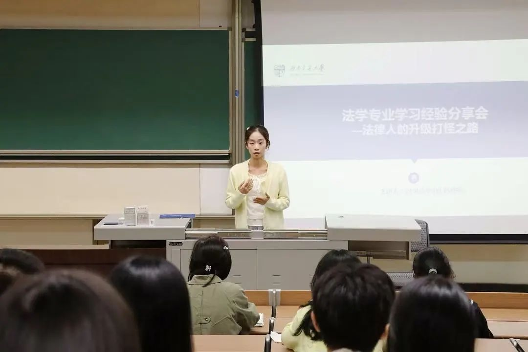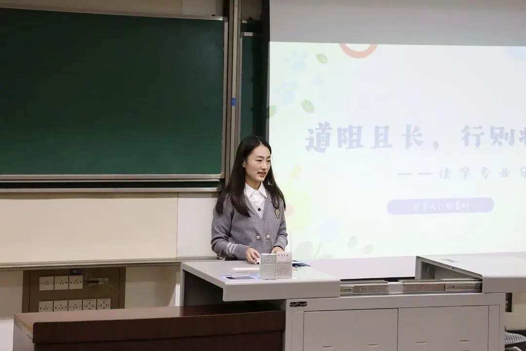 其次,陈炜婷同志以“法律人的升级打怪之路”为主题,以幽默诙谐的语气重点介绍了专业学习与学科竞赛的分享经验。由于法学学科专业性较强,她建议同学们先转变学习思维,建立系统性的学习方法。其次,她还围绕“预习”“上课”“复习”三方面详细展开专业课学习经验,并强调法条分析法与案例式教学的重要性,旨在培养同学们的检索意识。同时,在学科竞赛方面,她以自身经历为例,传授国家级,省级竞赛获奖经验。最后,陈炜婷同志希望同学们在大学不仅只会学习,还能通过多参与活动来全方面提升自己,度过充实的大学四年。
