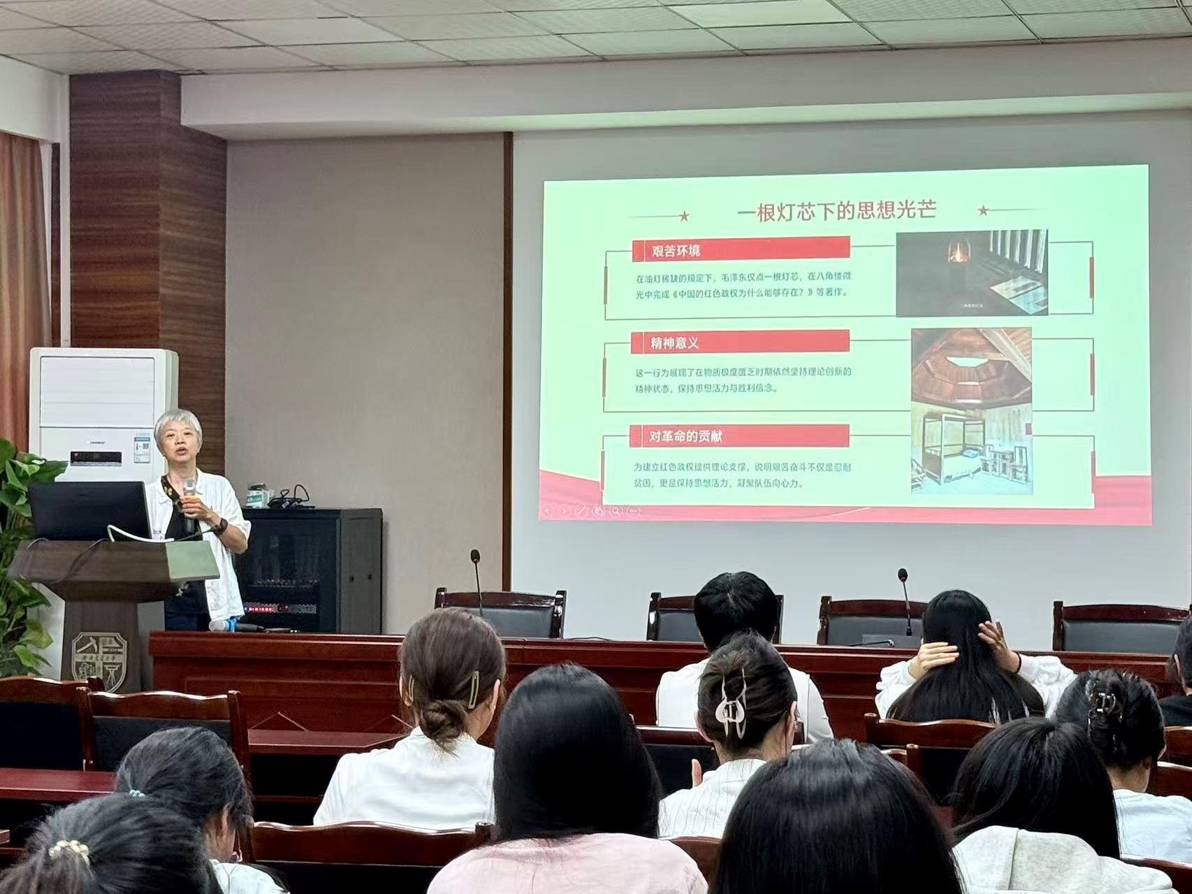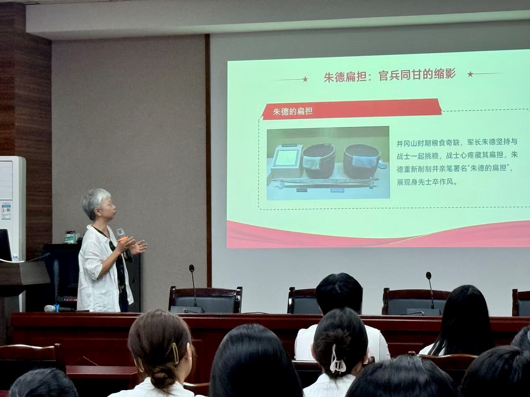 在讲述井冈山斗争时期的历史时,高书记重点通过“朱德的扁担”与“一根灯芯下的思想光芒”这两个经典故事,毛泽东同志、朱德同志与战士们同甘共苦的精神深刻阐释了老一辈革命家以身作则、艰苦奋斗的优良作风,同时,通过给大家讲述“一块牌匾的故事”生动展现军民融合的鱼水之情以及中国共产党密切联系群众的优良传统。