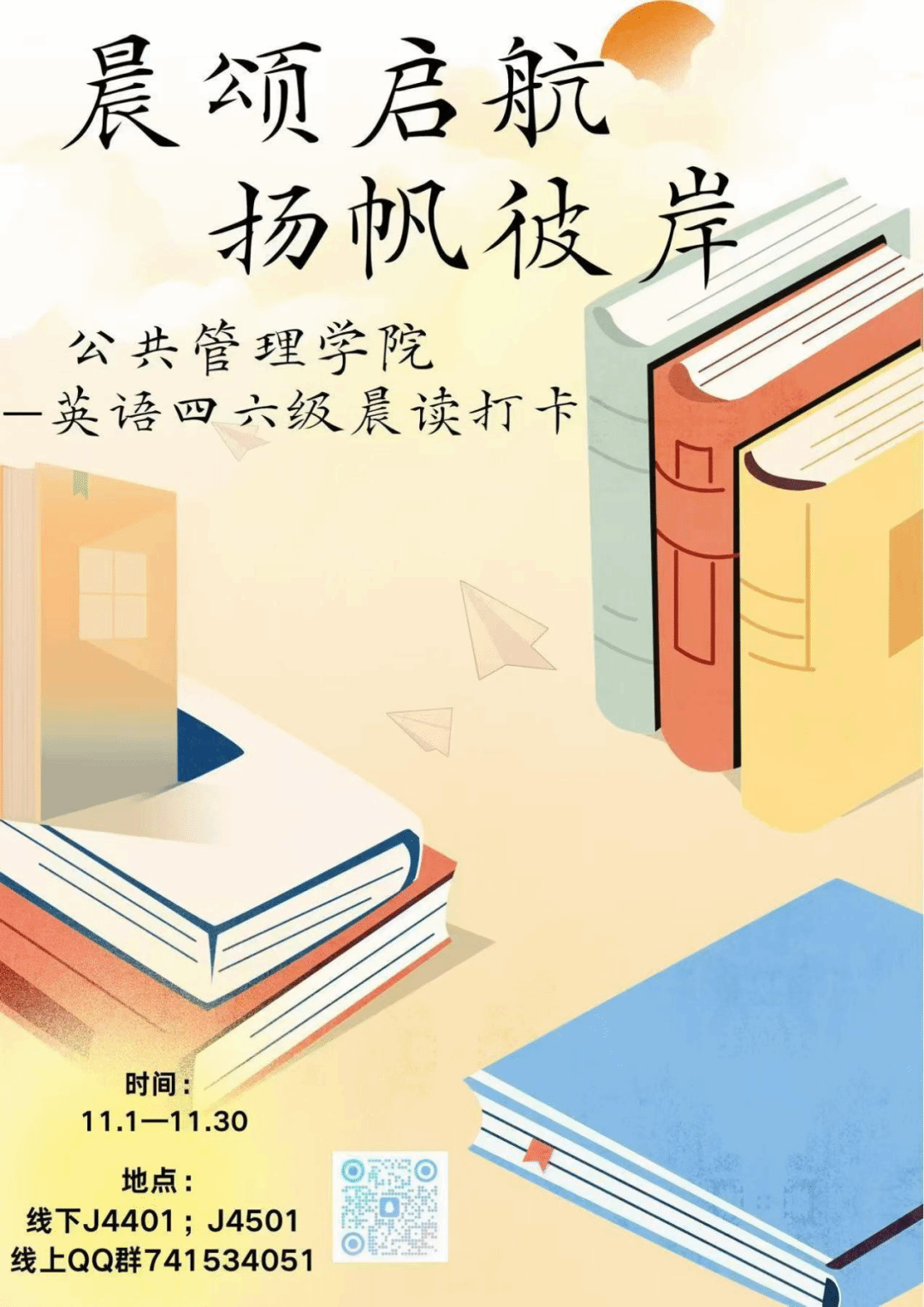 4. 线下晨读活动地点:williamhill官网九里校区四号教学自习室J4401、J4501。