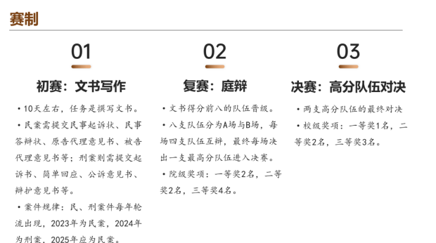 随后,杜星瑶同学详细梳理了模拟法庭的赛制流程与组队分工要点。针对初赛文书写作,她总结了民案与刑案交替出现的规律,并列举了各类文书具体的提交要求;复赛阶段则强调竞争机制,她提醒选手要尤为注重庭辩表现。在团队协作方面,提出“能力互补”原则,呼吁队员共同熟悉证据材料,避免“单点依赖”。最后,详细介绍文书撰写技巧,帮助同学们快速了解并初步掌握好写作规范的要求。