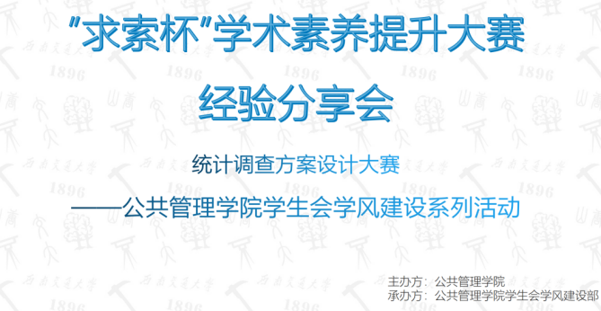 为搭建交流学习经验的平台,营造浓厚的学术研究氛围,提升同学们的学术素养,助力大家在各学科竞赛中取得优异成绩,威廉希尔,英国威廉希尔公司学生会于3月28日至4月2日期间以腾讯在线会议的形式开展了“求索杯”学术素养提升大赛经验分享会,活动邀请了往届赛事一等奖获得者分享赛事体验与心得。